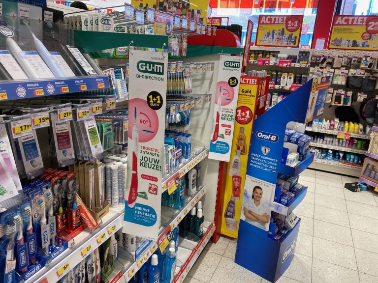 Deze banieren geven extra aandacht in het schap voor de “GUM® Bi-Direction”interdentale borstel.