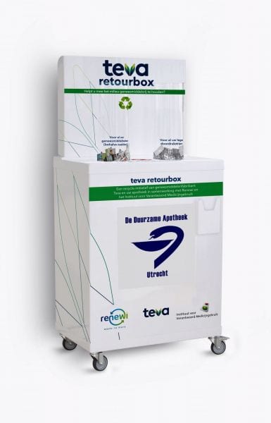 De Teva Retourbox een ontwikkeling én productie van XCJ reclameproductie in nauwe samenwerking met TEVA Nederland. Deze retourbox is voor de inzameling van restmedicatie en lege doordrukstrips. Zo helpen wij mee te voorkomen dat geneesmiddelenresten in het oppervlaktewater belanden via het riool en het huisafval. Alle apotheken in Nederland die medicijnresten en lege doordrukstrips op milieubewuste manier willen inzamelen en laten verwerken kunnen de Teva Retourbox bij Teva aanvragen.