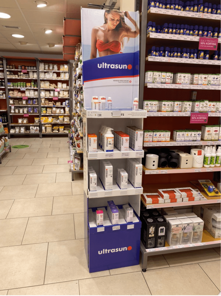 Vloerdisplay van Ultrasun (OTC Medical). Deze ranke presentatie presenteert een deel van het assortiment.